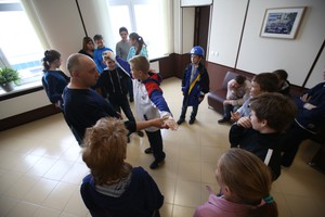 Разбившись на команды, дети строили электрическую сеть: изображали гидроэлектростанцию, воздушную линию электропередач, трансформатор, кабельную линию, распределительный пункт и, наконец, дом, где загорается свет.